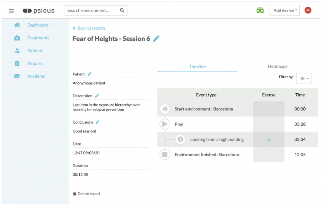 Otra forma de utilizar estas medida conductuales durante la intervención será comparar los MCP entre sesiones. Si por ejemplo el paciente ha realizado una misma tarea terapéutica (exposición a un entorno para trabajar ansiedad, entrenamiento de la atención mediante mindfulness….) en diferentes sesiones los MCP pueden ser de gran ayuda para monitorizar el cambio durante el entrenamiento. Recuerda que puedes acceder a toda la información de tus pacientes y de todo el contenido realizado durante las sesiones en el apartado Informes del menú lateral de Psious.pro.