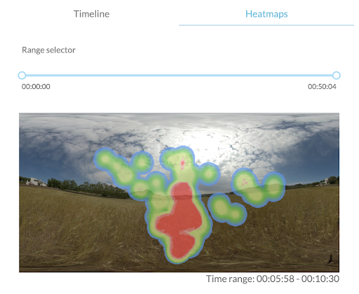 Los MCP de Psious buscan representar la orientación de la cabeza del paciente dentro de las escenas de realidad virtual. Con este método se consigue tener información del comportamiento del usuario y detectar qué elementos de los entornos son más observados por el usuario. Para poder ser interpretados visualmente los MCP necesitan por un lado el contexto de la escena y por otro los eventos activados durante la misma. Para lograr obtener esta información y representarla de manera accesible y sencilla Psious.pro almacena la dirección de la cabeza cada 0.3 seg y con esa información representa una gráfica superpuesta a una imagen equirectangular de la escena virtual, por ejemplo el avión durante el despegue estando sentado en la ventanilla con buen tiempo. Es necesario tener en cuenta que los datos de un MCP están directamente relacionados con el tiempo, es decir, la representación final de un heatmap nos da conocimiento de cómo se ha comportado el paciente dentro de un rango determinado de tiempo. Ese rango de tiempo puede ser de toda una sesión o de parte de ella. Para la representación de la orientación la cabeza y del tiempo invertido por el paciente se utiliza un gradiente de color (verde – rojo) donde el área representa las zonas dónde mira el paciente y el color representa el tiempo que el usuario ha estado mirando en esa dirección. Los colores cálidos (rojos) representan las áreas de mayor tiempo, los fríos (verdes-azules) señalan las zonas en las que el paciente ha interactuado menos. Finalmente las áreas sin colorear indican que no ha habido interacción con esas zonas de la escena. Psious.pro realiza un MCP para cada escena, es decir, cada vez que se cambia de entorno virtual… En una sesión puede haber un solo MCP o diversos. Antes de iniciar la escena terapéutica aparecerá un MCP sobre el entorno de espera (campo de trigo). Éste puede ser utilizado para línea base o adaptación.