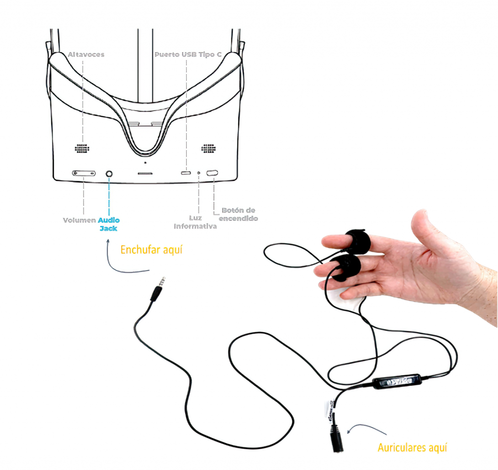 Enchufa el cable a las gafas usando la entrada del Audio jack.