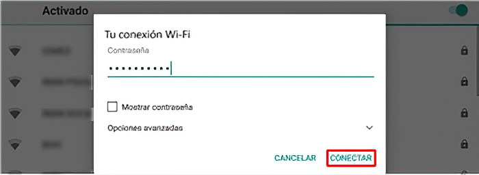 Ingresa la contraseña del wifi, enfoca en Conectar y presiona el botón de CONFIRMACIÓN.