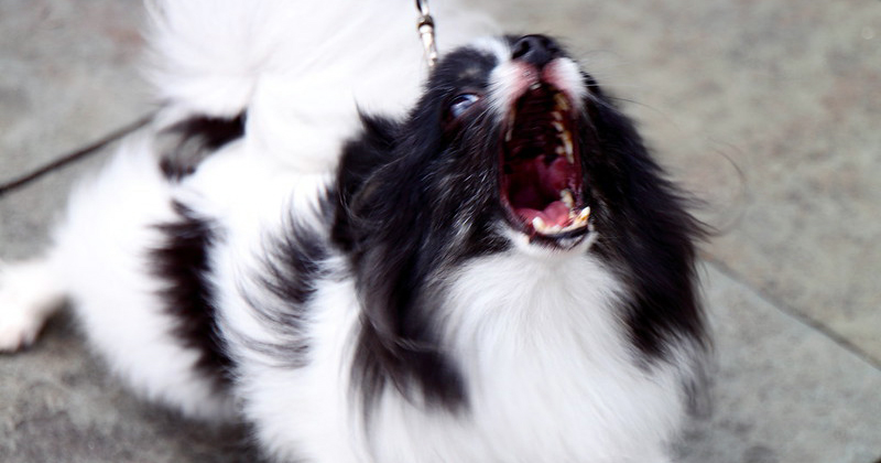 A lo lejos observo un perro sin bozal y ladrando, sentado y separado de su dueño pero atado con correa