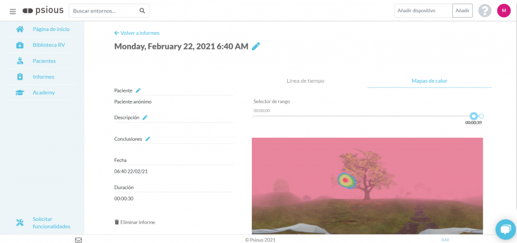 Tras finalizar una sesión, accede a la página del informe de fin de sesión y encontrarás la sección de mapas de calor. Mediante un deslizador puedes seleccionar el rango de tiempo en el que quieres visualizar los mapas de calor. Se te mostrarán varias imágenes relacionadas con momentos clave del entorno con el mapa de calor aplicado.