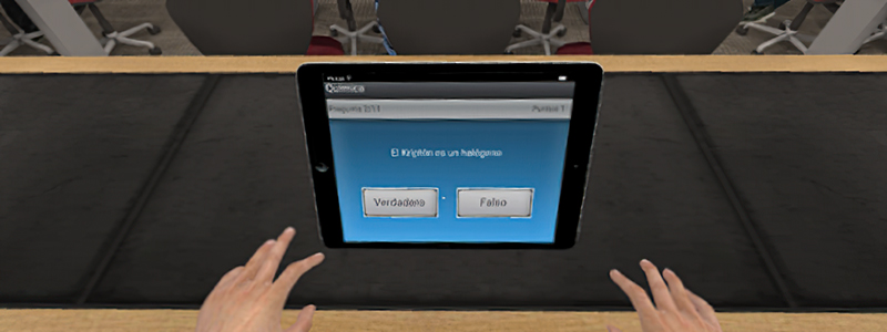 In the first moment, the patient is sitting in one of the audience seats. If no event is selected, the patient will remain in this position, and will only be placed on the stage if the healthcare professional selects the event “go on stage”. Once on stage, the user is sitting behind a table, from there they can make a short personal presentation and, afterwards, make a report on a previously prepared topic.